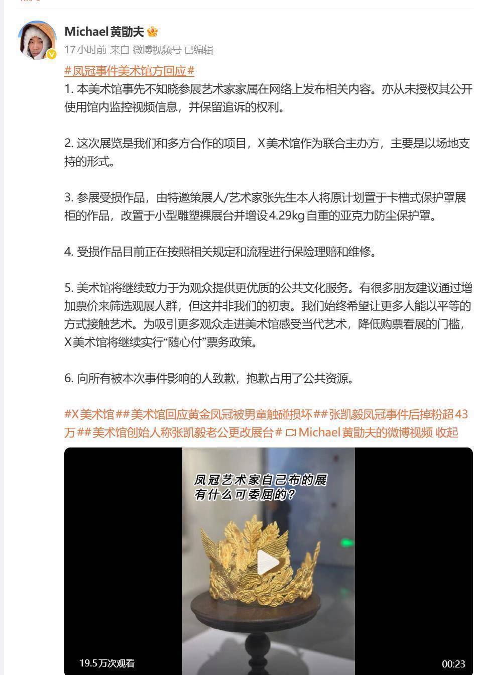 12月18日,X美术馆创始人黄勖夫发文回应近期发生的“凤冠被毁”事件,并附上了策展过程视频。