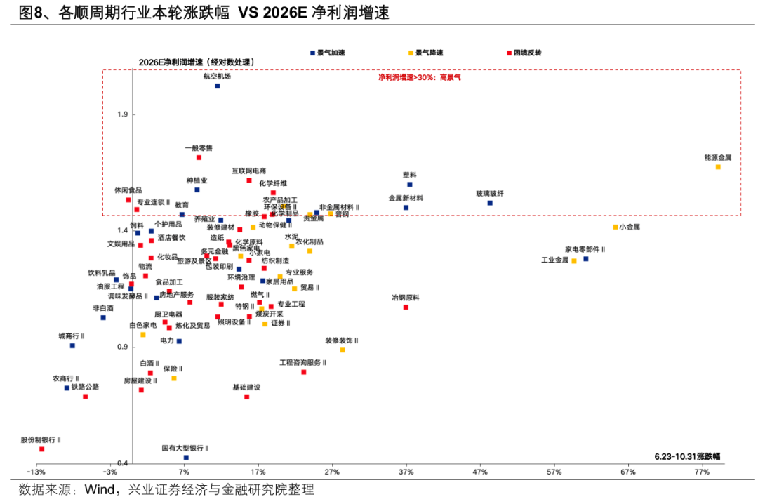 明年高景气(净利润增速>30%)且景气加速:包括建材(玻璃玻纤、塑料、非金属材料)、种植业、教育、航空机场等。