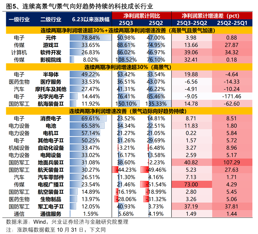 明年高景气(净利润增速>30%)且景气加速:包括AI硬件(通信设备、消费电子、半导体)、新能源(电池、风电设备)、军工(地面兵装)、计算机(IT服务),其中风电设备、地面兵装、IT服务本轮涨幅偏低。