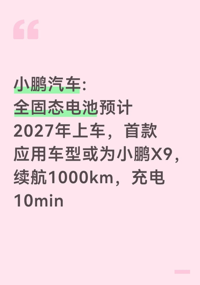 新能源车主的 “续航焦虑” 要被彻底终结了?有消息称小鹏汽车的全固态电池技术将在 2027 年正式量产装车,首款应用车型锁定热门 MPV 小鹏 X9,届时新车将实现 “1000km 续航 + 10 分钟快充” 的双重突破,这一消息直接让车友圈沸腾了。